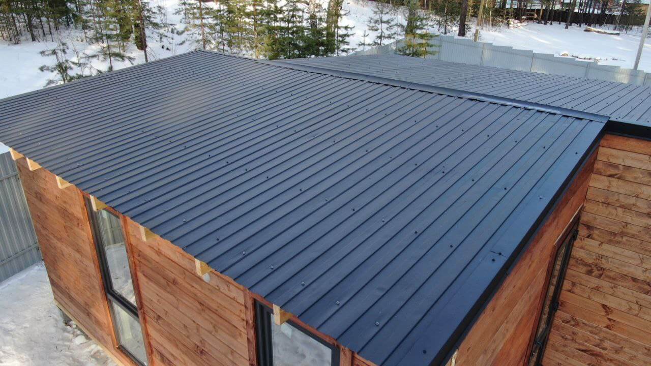Профнастил в оттенке "Серый Графит" прекрасно сочетается с деревянными строениями.