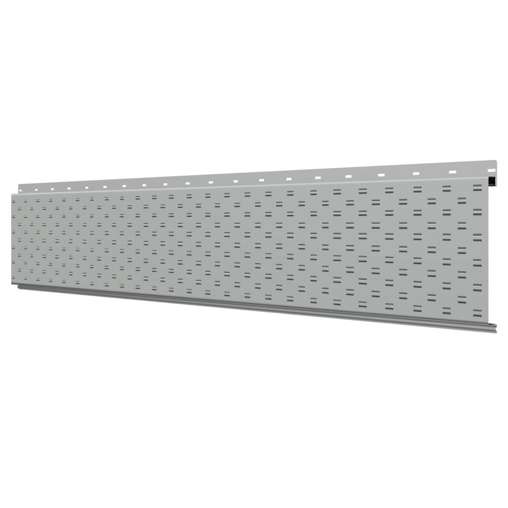 Линеарная потолочно-стеновая панель с ПЕРФОРАЦИЕЙ для вентиляции цвет RAL9006 Серебро применяется в качестве софитов для подшивы крыши, наружной и внутренней отделки потолков, стен, фронтонов фасада дома в Липецке.