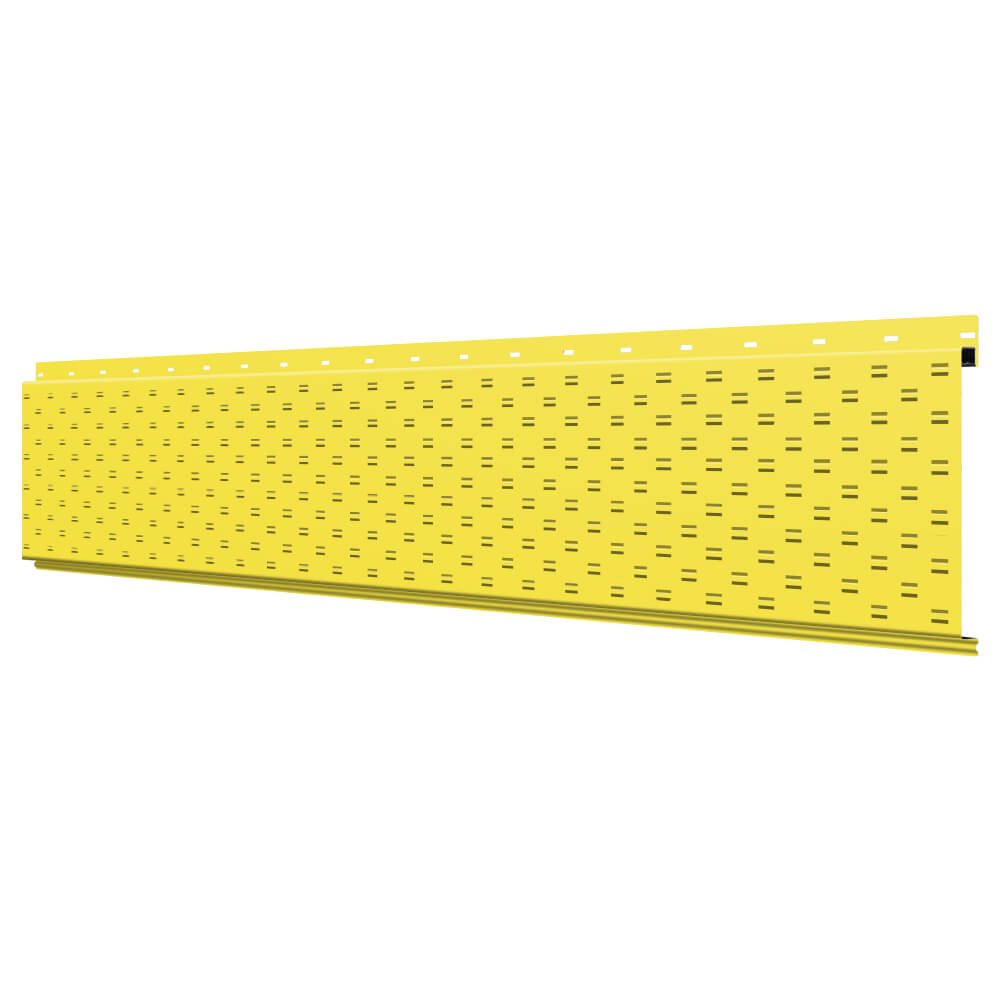 Линеарная потолочно-стеновая панель с ПЕРФОРАЦИЕЙ для вентиляции цвет RAL1018 Желтый применяется в качестве софитов для подшивы крыши, наружной и внутренней отделки потолков, стен, фронтонов фасада дома в Липецке.