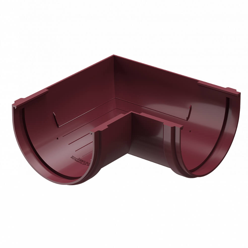 Угловой элемент желоба универсальный ДЕКЕ STANDARD d120мм 90 градусов цвет RAL 3005 Красный в Липецке. Угловые элементы устанавливаются как на внешних, так и на внутренних углах кровли и предназначены для соединения желобов.